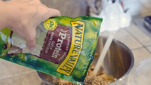 Step1Before opening, use your hands to crush 1 package (11 oz) Nature Valley™ protein oats 'n dark chocolate crunchy granola in the bag and ensure large pieces are broken up; set aside. In large bowl, mix 1/2 cup natural creamy peanut butter and 1/3 cup honey until thoroughly mixed.