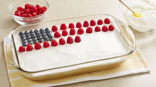 Step3Cool 30 minutes at room temperature, then refrigerate until firm, at least 2 hours but no longer than 8 hours. Spread whipped topping over top. Arrange blueberries in top left corner to create blue field of stars section of flag. Make 6 red stripes with the raspberries. Carefully cover with plastic wrap; refrigerate at least 1 hour but no longer than 8 hours. Cut into 5 rows by 4 rows.