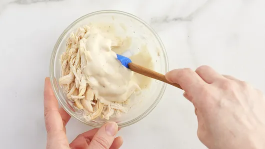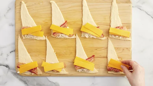 Step2Unroll dough; separate into 8 triangles. Spoon 2 tablespoons chicken mixture on wide end of each triangle; fold 1 slice of bacon in half, placing on top of chicken mixture. Add 2 strips of cheese on top of bacon.