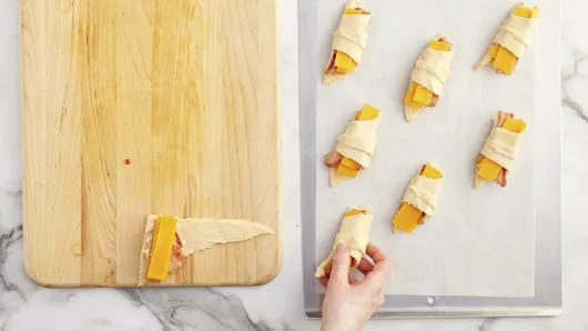 Step3Roll up each crescent, ending at tip of triangle. Place cheese side up on cookie sheet.