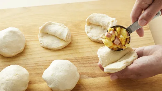 Separate dough into 8 biscuits; let stand 5 minutes. Gently pull each biscuit apart partially, leaving bottom and lower sides intact, forming a deep pocket. Place 1/4 cup egg mixture inside, pressing inside to fit. Gently stretch dough over filling, pressing and firmly sealing around edges of biscuit. Reshape into round, and place on cookie sheet. Repeat for remaining biscuits. (Biscuits will be full.)
