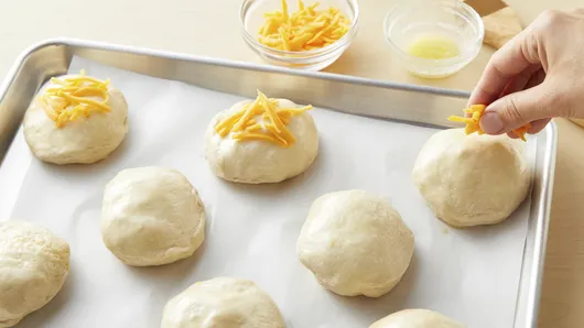 To Freeze and Reheat: Wrap each baked, cooled biscuit tightly in plastic wrap and a layer of foil. Transfer to large resealable freezer plastic bag; place in freezer. To reheat from frozen, remove one biscuit from storage bag; unwrap completely. Wrap biscuit in paper towel; place on microwavable plate. Microwave on Medium-Low (30%) 1 1/2 minutes; microwave on High 1 1/2 to 2 minutes or until biscuit bomb is heated through and center is at least 165°F. Let stand 1 minute before serving.