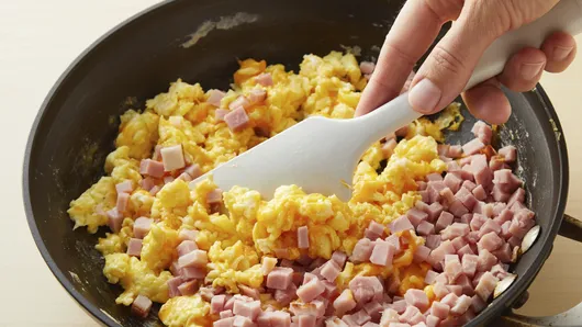In 10-inch nonstick skillet, melt 1 tablespoon of the butter over medium heat. Pour in beaten eggs; cook 1 1/2 to 2 1/2 minutes, stirring frequently, until eggs are firm but still moist. Remove from heat; stir in remaining cheese until melted. Add ham; stir mixture well. Cool 5 minutes.