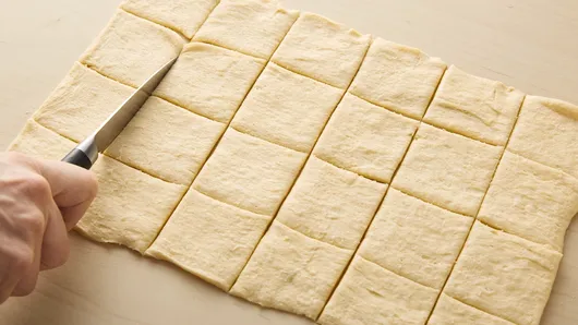 Step3Unroll dough on work surface. Press into 12x8-inch rectangle. (If using crescent roll dough, firmly press perforations to seal.) With pizza cutter or sharp knife, cut into 6 rows by 4 rows to make 24 squares.