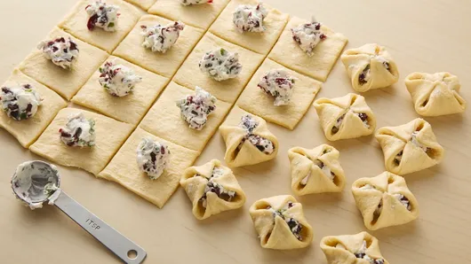 Step4Place 1 teaspoon cream cheese mixture onto center of each square. Bring 4 corners together to overlap slightly in center at top of each bundle. Twist and pinch to seal, leaving small gaps between seams. Place on cookie sheets.