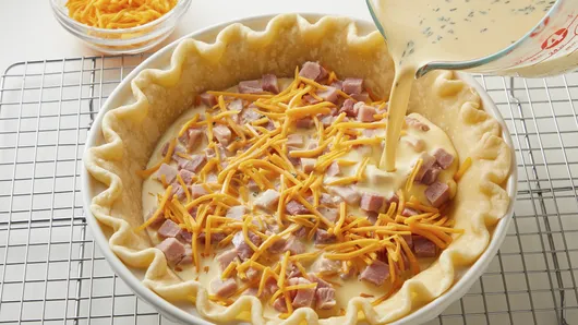 var configuration = {"title":"Ham and Cheddar Quiche","introduction":"This simple-yet-showstopping quiche preps in just 15 minutes but tastes like you spent hours making it. Pillsbury™ pie crust makes quick work of the base, and the filling comes together using just five ingredients including ham, cheddar cheese and chopped fresh thyme. Bake it all together and serve for a truly delicious brunch dish that wows.\n","servingSize":"1 Serving","image":{"small":{"media":"(min-width: 0px)","src":"https://mojo.generalmills.com/api/public/content/K5c67ke2KES_gEV1FJKbJQ_webp_base.webp?v=c261ada3\u0026t=e724eca7b3c24a8aaa6e089ed9e611fd"},"medium":{"media":"(min-width: 500px)","src":"https://mojo.generalmills.com/api/public/content/K5c67ke2KES_gEV1FJKbJQ_webp_base.webp?v=c261ada3\u0026t=191ddcab8d1c415fa10fa00a14351227"},"large":{"media":"(min-width: 767px)","src":"https://mojo.generalmills.com/api/public/content/K5c67ke2KES_gEV1FJKbJQ_webp_base.webp?v=c261ada3\u0026t=191ddcab8d1c415fa10fa00a14351227"},"alt":"Ham and Cheddar Quiche"},"contributor":{"label":"By","name":"Pillsbury Kitchens","profileUrl":"/about-us","displayDate":{"label":"Updated","date":"Sep 6, 2019"}},"ingredientGroups":[{"ingredients":[{"quantity":"1 ","description":"crust from 1 box (14.1 oz) refrigerated Pillsbury™ Pie Crusts (2 Count), softened as directed on box ","productLink":"/products/pie-crust/refrigerated-pie-crust"},{"quantity":"1 ","description":"cup diced cooked ham "},{"quantity":"1 ","description":"cup shredded cheddar cheese (4 oz)"},{"quantity":"4 ","description":"eggs "},{"quantity":"1 ","description":"cup half-and-half "},{"quantity":"1 1/2 ","description":"teaspoons chopped fresh thyme leaves "},{"quantity":"1/4 ","description":"teaspoon salt "},{"quantity":"1/8 ","description":"teaspoon pepper "}]}],"steps":[{"description":"Heat oven to 375°F. Place pie crust in 9-inch glass pie plate as directed on box for One-Crust Filled Pie. Do not prick crust. Bake 10 minutes. If necessary, use flat bottom of metal measuring cup to carefully press down on baked pie crust to flatten. Cool 10 minutes. ","stepShotImageUrl":"//mojo.generalmills.com/api/public/content/_3pmsBJ6WkeS_JcEMZ_rXg_webp_base.webp?v=369c820d\u0026t=51a43a57af4046789e5a7f20567b1195"},{"description":"Layer ham and 1/2 cup of the cheese in bottom of pie plate. In medium bowl, beat eggs and half-and-half with whisk. Stir in 1 teaspoon of the thyme, the salt and pepper. Pour egg mixture over ham and cheese. Sprinkle with remaining 1/2 cup cheese. ","stepShotImageUrl":"//mojo.generalmills.com/api/public/content/OKkeq7nS1kCnXbK77wdabA_webp_base.webp?v=7b09d380\u0026t=51a43a57af4046789e5a7f20567b1195"},{"description":"Bake 30 to 35 minutes or until knife inserted in center comes out clean. Cover edge of crust with strips of foil after 15 to 20 minutes of baking to prevent excessive browning. Let stand 15 minutes before serving. Garnish with remaining 1/2 teaspoon thyme. Cut into wedges to serve. "}],"tips":[{"title":"","description":"Prebaking the pie crust produces a browner, sturdier bottom to support the filling.\n","category":"Techniques","tipShots":[]},{"title":"","description":"Use leftover cooked ham or prechopped ham from the deli meat section of the grocery store.\n","category":"Recipe/Ingredient Facts","tipShots":[]},{"title":"","description":"Don\u0027t swap fresh thyme for an equal amount of dried thyme. Dried herbs and seasonings tend to pack a more concentrated flavor than fresh, so results will not be the same with equal substitution.\n","category":"Recipe/Ingredient Facts","tipShots":[]},{"title":"","description":"Swap foil to cover edges of pie crust with a pie crust protector shield, if desired","category":"Techniques","tipShots":[]},{"title":"","description":"Serve quiche with a side of fresh fruit for breakfast or brunch.\n","category":"Serving Suggestions/Menu","tipShots":[]},{"title":"","description":"Can\u0027t get enough quiche? We have all the \u003ca href=\u0022https://www.pillsbury.com/recipes/ingredient/eggs/quiches\u0022 target=\u0022_blank\u0022\u003eQuiche Recipes\u003c/a\u003e you could ever want.","category":"Editorial","tipShots":[]},{"title":"","description":"Kitchen Tested: 8/2019","category":"Kitchen Tested","tipShots":[]}],"kitchenTips":[{"title":"","description":"Prebaking the pie crust produces a browner, sturdier bottom to support the filling.\n","category":"Techniques","tipShots":[]},{"title":"","description":"Use leftover cooked ham or prechopped ham from the deli meat section of the grocery store.\n","category":"Recipe/Ingredient Facts","tipShots":[]},{"title":"","description":"Don\u0027t swap fresh thyme for an equal amount of dried thyme. Dried herbs and seasonings tend to pack a more concentrated flavor than fresh, so results will not be the same with equal substitution.\n","category":"Recipe/Ingredient Facts","tipShots":[]},{"title":"","description":"Swap foil to cover edges of pie crust with a pie crust protector shield, if desired","category":"Techniques","tipShots":[]},{"title":"","description":"Serve quiche with a side of fresh fruit for breakfast or brunch.\n","category":"Serving Suggestions/Menu","tipShots":[]}],"additionalContent":[],"faq":[],"tipCategories":[{"categoryName":"Editorial","heading":"More About This Recipe","cssClass":"recipePartStory","expandOnInit":false,"expandText":"More +","collapseText":"Less -","expandEventName":"","collapseEventName":"","image":"","tips":[{"title":"","description":"Can\u0027t get enough quiche? We have all the \u003ca href=\u0022https://www.pillsbury.com/recipes/ingredient/eggs/quiches\u0022 target=\u0022_blank\u0022\u003eQuiche Recipes\u003c/a\u003e you could ever want.","category":"Editorial","tipShots":[]}],"isExpandable":false},{"categoryName":"Kitchen Tested","heading":"More About This Recipe","cssClass":"recipePartStory","expandOnInit":false,"expandText":"More +","collapseText":"Less -","expandEventName":"","collapseEventName":"","image":"","tips":[{"title"