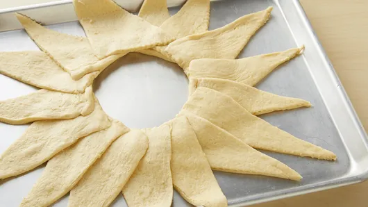 Step3Unroll both cans of dough; separate into 16 triangles. On ungreased large cookie sheet, arrange triangles in ring so short sides of triangles form a 5-inch circle in center. Dough will overlap. Dough ring should look like a sun.
