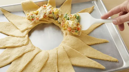 Step4Carefully spoon chicken mixture on the half of each triangle closest to center of ring.