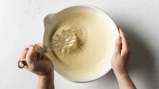 Pour batter by 1/4 cupfuls onto hot skillet or griddle.