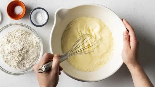 In large bowl, beat milk, eggs, and oil with whisk until well blended.