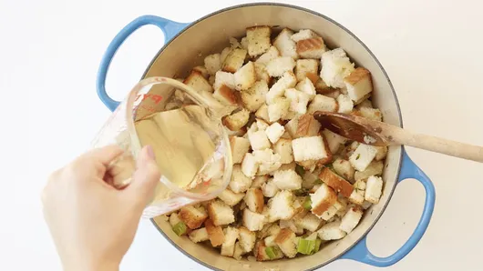 If you pour all your liquid in at once, you risk over-soaking the mixture, leading to a mushy or gummy texture. It’s much easier to add more liquid than to fix an overly wet mixture, so start by adding the liquid 1/4 cup at a time. Stir the mixture and check before each addition. Add until the stuffing reaches a moist but not soggy texture that will hold together without falling apart. The bread should absorb most of the liquid with no extra at the bottom of the bowl. However, don’t skimp on liquid as too little liquid will leave your stuffing dry and crumbly.