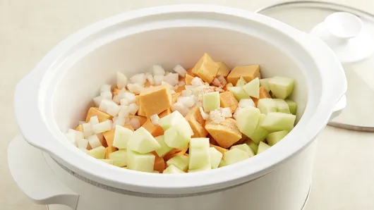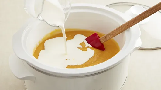 var configuration = {"title":"Slow-Cooker Butternut Squash Soup","introduction":"Add fresh apple for a twist on a classic restaurant favorite you can make your own kitchen with the help of the slow cooker. For extra ease, buy peeled and pre-cut squash—or DIY if you have time!","servingSize":"1 Cup","image":{"small":{"media":"(min-width: 0px)","src":"https://mojo.generalmills.com/api/public/content/kImOJWXogEOJKT6nNWciAA_webp_base.webp?v=4671c881\u0026t=e724eca7b3c24a8aaa6e089ed9e611fd"},"medium":{"media":"(min-width: 500px)","src":"https://mojo.generalmills.com/api/public/content/kImOJWXogEOJKT6nNWciAA_webp_base.webp?v=4671c881\u0026t=191ddcab8d1c415fa10fa00a14351227"},"large":{"media":"(min-width: 767px)","src":"https://mojo.generalmills.com/api/public/content/kImOJWXogEOJKT6nNWciAA_webp_base.webp?v=4671c881\u0026t=191ddcab8d1c415fa10fa00a14351227"},"alt":"Slow-Cooker Butternut Squash Soup"},"contributor":{"label":"By","name":"Pillsbury Kitchens","profileUrl":"/about-us","displayDate":{"label":"Updated","date":"Jan 26, 2023"}},"ingredientGroups":[{"ingredients":[{"quantity":"2","description":"lb butternut squash, peeled and cubed (about 6 cups)"},{"quantity":"1","description":"large apple, peeled, chopped"},{"quantity":"1/2","description":"cup chopped onion"},{"quantity":"1","description":"teaspoon salt"},{"quantity":"1/8","description":"teaspoon ground red pepper (cayenne)"},{"quantity":"1 1/4","description":"cups Progresso™ chicken broth (from 32-oz carton)"},{"quantity":"1/2","description":"cup heavy whipping cream"}]}],"steps":[{"description":"Spray 4- to 5-quart slow cooker with cooking spray. Add all ingredients except whipping cream.","stepShotImageUrl":"//mojo.generalmills.com/api/public/content/ET29AzjiSUO6GJEHk8fJkQ_webp_base.webp?v=d2f266c8\u0026t=51a43a57af4046789e5a7f20567b1195"},{"description":"Cover; cook on High heat setting 4 to 5 hours."},{"description":"Pour half of the squash mixture into blender. Cool 5 minutes. Cover; blend until smooth. Pour into 8-cup measuring cup or large heatproof bowl. Repeat with remaining squash mixture. Return squash mixture to slow cooker. Stir in whipping cream.","stepShotImageUrl":"//mojo.generalmills.com/api/public/content/Jk3k-fYhDU-4qDUlUa-lCQ_webp_base.webp?v=abb259b9\u0026t=51a43a57af4046789e5a7f20567b1195"},{"description":"Cover; cook on High heat setting about 5 minutes or until heated through."}],"tips":[{"title":"","description":"For a flavor twist, stir in 1/2 teaspoon ground cinnamon, chopped fresh thyme or curry powder.","category":"Variation","tipShots":[]},{"title":"","description":"Purchase peeled, precut butternut squash in the produce aisle of your favorite grocery store.","category":"Time Saving","tipShots":[]},{"title":"","description":"Sprinkle a little cayenne pepper over top of the soup as a garnish, if desired.","category":"Presentation/Garnish","tipShots":[]},{"title":"","description":"When blending hot liquids, it is very important that you not seal the blender, or you could risk it exploding. Remove the center portion of the blender lid, and loosely cover with a kitchen towel instead.","category":"Techniques","tipShots":[]},{"title":"","description":"Not sure how to peel and cut a butternut squash before making butternut squash soup? The task can be a little daunting if you’ve never done it before. But it doesn’t have to be! Just make sure you have a large, sharp kitchen knife and a sharp vegetable peeler. Small, dull knives will make this task much more difficult and also quite dangerous!\r\n\r\nFirst, cut off the ends of the squash; this way, it will be easier to stabilize when you’re peeling. Peel the whole squash (though the skin is technically edible, you won’t want it in your soup), cut it in half and scoop out the seeds with a spoon. Next, cut the squash into rings, and then into individual cubes. Don’t get too hung up on cube size—as long as they are all relatively uniform and roughly 1-inch cubes, they are ready for cooking. \r\n\r\nDon’t feel like doing all of this work? Don’t sweat it. A lot of grocery stores carry packages of butternut squash that’s already peeled and cubed. After you try this recipe, slow-cooker butternut squash soup will become one of your new favorite fall dishes. Get more squash soup recipes \u003ca href=\u0022https://www.pillsbury.com/recipes/dish-type/soup/butternut-squash-soup\u0022 target=\u0022_blank\u0022\u003e here\u003c/a\u003e and read \u003ca href=\u0022https://www.pillsbury.com/everyday-eats/dinner-tonight/ways-to-take-your-soup-up-a-notch\u0022 target=\u0022_blank\u0022\u003e this article\u003c/a\u003e to stay inspired all throughout soup season.","category":"Editorial","tipShots":[]},{"title":"","description":"Kitchen Tested - 6/2016.","category":"Kitchen Tested","tipShots":[]}],"kitchenTips":[{"title":"","description":"For a flavor twist, stir in 1/2 teaspoon ground cinnamon, chopped fresh thyme or curry powder.","category":"Variation","tipShots":[]},{"title":"","description":"Purchase peeled, precut butternut squash in the produce aisle of your favorite grocery store.","category":"Time Saving","tipShots":[]},{"title":"","description":"Sprinkle a little cayenne pepper over top of the soup as a garnish, if desired.","category":"Presentation/Garnish","tipShots":[]},{"title":"","description":"When blending hot liquids, it is very important that you not seal the blender, or you could risk it exploding. Remove the center portion of the blender lid, and loosely cover with a kitchen towel instead.","category":"Techniques","tipShots":[]}],"additionalContent":[],"faq":[],"tipCategories":[{"categoryName":"Editorial","heading":"More About This Recipe","cssClass":"recipePartStory","expandOnInit":false,"expandText":"More +","collapseText":"Less -","expandEventName":"","collapseEventName":"","image":"","tips":[{"title":"","description":"Not sure how to peel and cut a butternut squash before making butternut squash soup? The task can be a little daunting if 