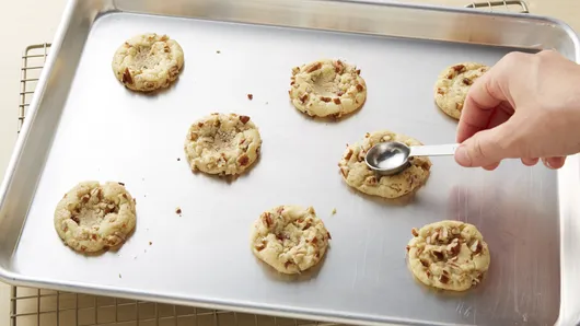 Bake 8 to 12 minutes or until edges are set and light golden brown. Using back of round metal measuring teaspoon, make 1 1/4-inch indentation in center of each cookie. Cool 1 minute on cookie sheets; remove to cooking racks. Cool completely, about 30 minutes.