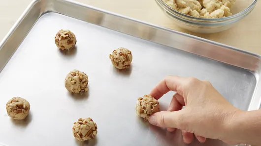 In medium bowl, crumble cookie dough; stir or knead in flour until well mixed. (DO NOT EAT RAW COOKIE DOUGH AFTER COMBINING WITH FLOUR.) Shape dough into 36 (about 1-inch) balls. Roll and slightly press balls in pecans (do not flatten). Place 1 inch apart on ungreased cookie sheets.