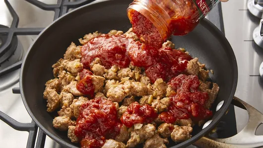 Heat oven to 350°F. In 10-inch nonstick skillet, cook sausage, onion and garlic over medium-high heat 5 to 7 minutes, stirring occasionally, until no longer pink; drain. Stir in pasta sauce.