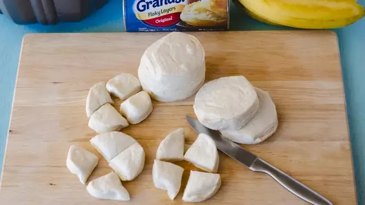 Step2Separate 2 cans (16.3 oz each) Pillsbury™ Grands!™ Flaky Layers refrigerated biscuits into 16 biscuits. Cut each biscuit into quarters.