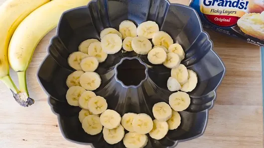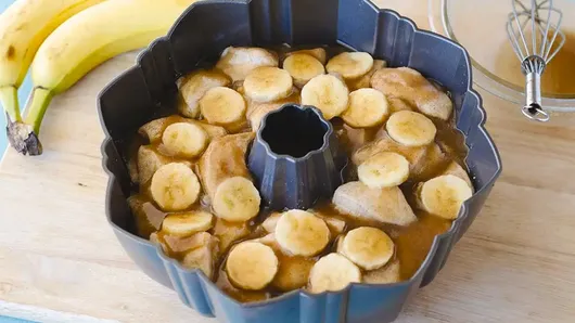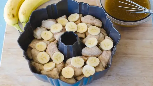 Step1Heat oven to 350°F. Spray 12-cup fluted tube cake pan with cooking spray. Arrange 1 1/2 bananas, sliced, in bottom of pan.
