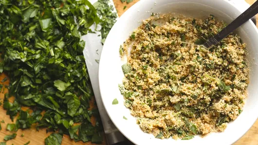 Step4In small bowl, mix 1/2 cup Progresso™ plain bread crumbs, 1/4 cup chopped fresh parsley leaves, 2 tablespoons olive oil, and salt and pepper to taste. Sprinkle over top of asparagus.