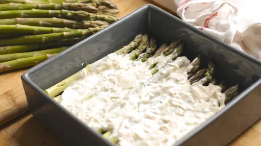 Step3In baking dish, place one-third of the asparagus spears in single layer, and top with one-third of the sauce mixture; repeat twice to use up.
