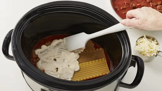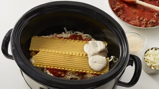 Step3Layer 3 lasagna noodles over sauce in slow cooker, breaking noodles as necessary. Top with 1/3 of the Alfredo pasta sauce, spreading evenly. Sprinkle with 1 cup of the mozzarella cheese. Top with 1/3 of the ground beef mixture, spreading evenly.