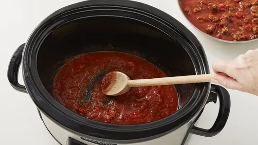 Step2Spray 4 to 5-quart slow cooker with nonstick cooking spray. Spread 3/4 cup of the tomato pasta sauce in bottom of sprayed slow cooker. Stir remaining tomato pasta sauce and tomato sauce into ground beef.