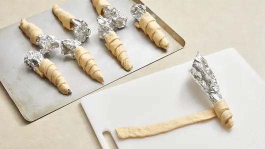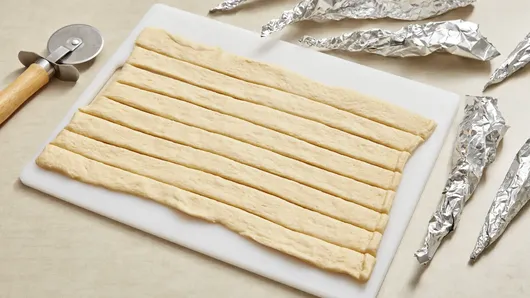 Step1Heat oven to 400°F. Roll sheets of foil from shorter ends into cone-shaped molds. Unroll dough on work surface; if using crescent rolls, press seams to seal. Use pizza cutter or knife to cut dough lengthwise into 8 (1-inch) strips.