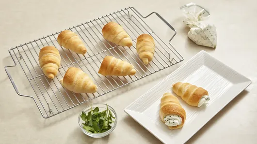 Step4In medium bowl, beat cream cheese, parsley, chives, lemon peel and salt with electric mixer on medium speed until smooth and combined. Pipe or spoon cream cheese mixture into cavity of each crescent. Top with 2 sprigs parsley for carrot top.