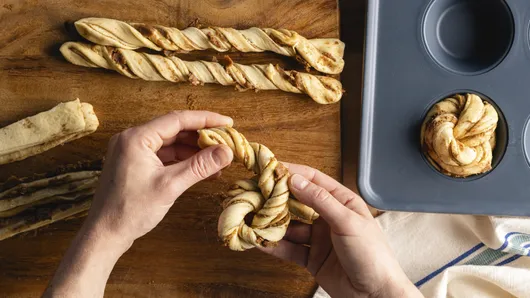 Cut each dough strip in half lengthwise. Gently stretch and twist each piece into a rope, then twist two ropes together. Tie each twist into a knot and place in a muffin pan.