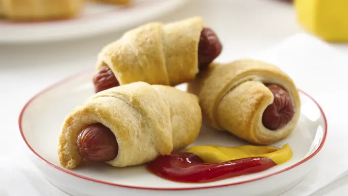 Step2Spread mustard on other side of each rectangle. Place hot dog on short end of each rectangle, mustard side up. Roll up; pinch edge to seal. Place seam side down on ungreased cookie sheet.