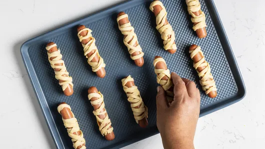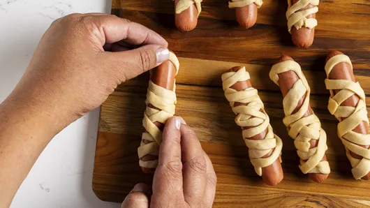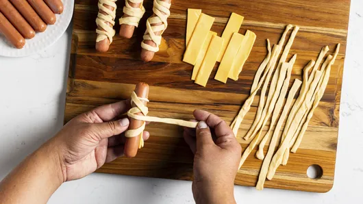 Mummy hot dogs are an easy Halloween snack or meal made by wrapping hot dogs in thin strips of crescent dough to resemble mummy bandages.