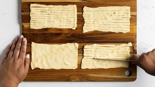 Take the crescent dough out of the can and separate it at the perforations so you have 4 large rectangles. Cut each sheet of dough lengthwise into thin strips. Generally, thinner strips will work better—we found the most success wrapping and baking with strips that were about 1 cm wide.