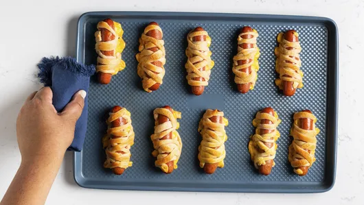 We like reheating our mummy hot dogs in an air fryer or toaster oven—we’d recommend 350 for 5 to 10 minutes until they’re warm and crispy again. We wouldn’t recommend using a microwave to reheat, because it will make the crescent pastry too mushy on the outside.