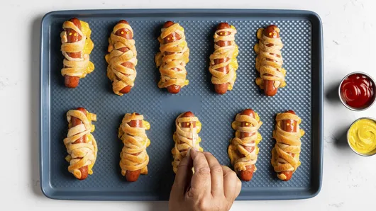 These adorable crescent-wrapped mummy hot dogs are a great dish to serve during the spookiest season of the year, and they’re the perfect dinner to serve on Halloween before your kids head out trick-or-treating. We know this time of year can be busy—this family-friendly recipe makes 10 servings and is ready in less than an hour.
