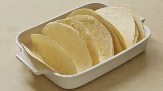 Fold tortillas in half and place folded-side-down in dish; set aside.