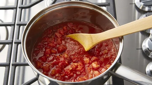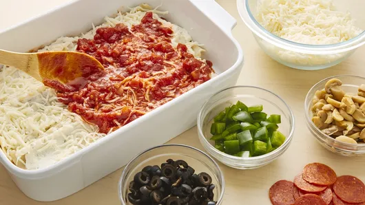 Step2Meanwhile, heat oven to 350°F. Spray 12x8-inch (2-quart) glass baking dish with nonstick cooking spray. In medium saucepan, combine pizza sauce and tomatoes; cook until thoroughly heated.