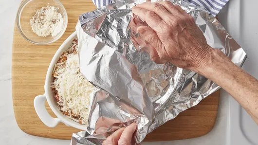 Cover the baking dish with foil before popping it into the oven. Covering the dish helps to keep the pasta from drying out during baking.