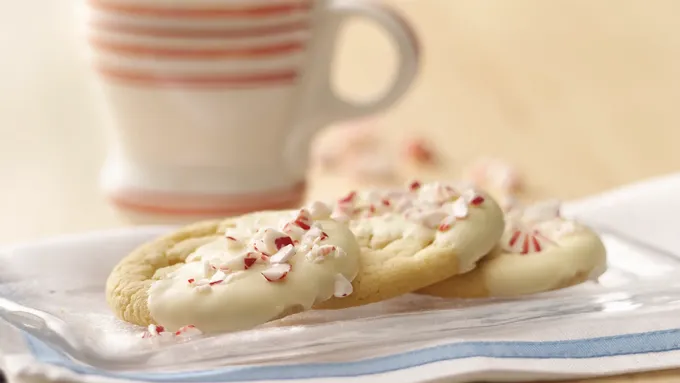 Step4Microwave reserved baking chips uncovered on High, stirring every 30 seconds, until melted and smooth. Dip cooled cookies half way into melted baking chips; place on cooking parchment paper. Let stand until set. Store in airtight container, using waxed paper between cookie layers.