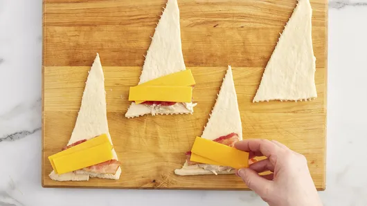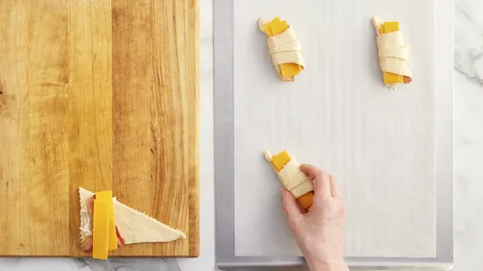Step3Roll up each crescent, ending at tip of triangle. Place cheese side up on cookie sheet.