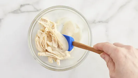 Step2Unroll dough; separate into 4 triangles. Spoon 2 tablespoons of the chicken mixture on wide end of each triangle; fold 1 slice of bacon in half, placing on top of chicken mixture. Add 2 strips of cheese on top of bacon.