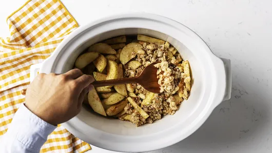 var configuration = {"title":"Slow-Cooker Praline Apple Crisp","introduction":"\u003cp\u003eThere are so many reasons to love an apple crisp: It makes the most of this season’s most beloved fruit. It’s a fall classic that comes together fast enough to satisfy a last-minute weeknight craving for dessert. And, as it bakes, it creates all those wonderful apple-pie-in-the-oven smells, without all the labor of making a crust. (Seriously, someone should make an apple crisp candle!)\u003c/p\u003e\n\n\n\u003cp\u003eThis recipe is all that, plus an amazing hack—you make it in the slow cooker.\u003c/p\u003e","servingSize":"1/2 Cup","image":{"small":{"media":"(min-width: 0px)","src":"https://mojo.generalmills.com/api/public/content/THhIhLcMA0ahIyHmtkTZiw_webp_base.webp?v=a631497d\u0026t=e724eca7b3c24a8aaa6e089ed9e611fd"},"medium":{"media":"(min-width: 500px)","src":"https://mojo.generalmills.com/api/public/content/THhIhLcMA0ahIyHmtkTZiw_webp_base.webp?v=a631497d\u0026t=191ddcab8d1c415fa10fa00a14351227"},"large":{"media":"(min-width: 767px)","src":"https://mojo.generalmills.com/api/public/content/THhIhLcMA0ahIyHmtkTZiw_webp_base.webp?v=a631497d\u0026t=191ddcab8d1c415fa10fa00a14351227"},"alt":"Slow-Cooker Praline Apple Crisp"},"contributor":{"label":"By","name":"Pillsbury Kitchens","profileUrl":"/about-us","displayDate":{"label":"Updated","date":"Aug 31, 2023"}},"ingredientGroups":[{"ingredients":[{"quantity":"6","description":"medium-size crisp tart apples, peeled, cut into 1/2-inch-thick slices (about 6 cups)"},{"quantity":"1","description":"teaspoon ground cinnamon"},{"quantity":"1/2","description":"cup quick-cooking oats"},{"quantity":"1/3","description":"cup packed brown sugar"},{"quantity":"1/4","description":"cup all-purpose flour"},{"quantity":"1/2","description":"cup cold butter, cut into small pieces"},{"quantity":"1/2","description":"cup chopped pecans"},{"quantity":"1/2","description":"cup toffee bits"},{"quantity":"","description":"Vanilla ice cream, if desired"}]}],"steps":[{"description":"Spray 3- to 4-quart slow cooker with cooking spray. ","stepShotImageUrl":"//mojo.generalmills.com/api/public/content/YSha8vDUHUapiytI3u7Aew_webp_base.webp?v=ab01754e\u0026t=51a43a57af4046789e5a7f20567b1195"},{"description":"In large bowl, mix apples and cinnamon to coat.","stepShotImageUrl":"//mojo.generalmills.com/api/public/content/9-CYCI7PTE24aOCynEv4Tw_webp_base.webp?v=f4d6aeae\u0026t=51a43a57af4046789e5a7f20567b1195"},{"description":"Place in slow cooker.","stepShotImageUrl":"//mojo.generalmills.com/api/public/content/_igSsEu4kUmShaVj8lD6Sw_webp_base.webp?v=9bfa1718\u0026t=51a43a57af4046789e5a7f20567b1195"},{"description":"In medium bowl, mix oats, brown sugar, flour and butter with pastry blender or fork until crumbly. ","stepShotImageUrl":"//mojo.generalmills.com/api/public/content/m5NILEHLp0GJ8T7A0aWb5w_webp_base.webp?v=387dcf97\u0026t=51a43a57af4046789e5a7f20567b1195"},{"description":"Stir in pecans and toffee bits. ","stepShotImageUrl":"//mojo.generalmills.com/api/public/content/A3zxvLbsrEi86raI8SXZfA_webp_base.webp?v=b687080a\u0026t=51a43a57af4046789e5a7f20567b1195"},{"description":"Sprinkle crumb mixture evenly over apples.","stepShotImageUrl":"//mojo.generalmills.com/api/public/content/_fVQZpB2-U-10RjGMTaBRw_webp_base.webp?v=cae22867\u0026t=51a43a57af4046789e5a7f20567b1195"},{"description":"Cover; cook on Low heat setting 4 to 6 hours. ","stepShotImageUrl":"//mojo.generalmills.com/api/public/content/FYg8bWzPjkOqrnwkVmPRkw_webp_base.webp?v=493b2fff\u0026t=51a43a57af4046789e5a7f20567b1195"},{"description":"Serve apple crisp warm or at room temperature topped with ice cream.","stepShotImageUrl":"//mojo.generalmills.com/api/public/content/y61l1xxe9UKFlvaB-6E8EA_webp_base.webp?v=2704dc57\u0026t=51a43a57af4046789e5a7f20567b1195"}],"tips":[{"title":"","description":"If you want this recipe to come together even quicker, you can make the topping the day before you need it. Just cover the bowl with plastic wrap and store it in the refrigerator. Pull it out about 5 minutes before you want to use it, so it can soften. ","category":"Time Saving","tipShots":[]},{"title":"","description":"If you\u0027d like the apple slices to retain their shape and have a slightly firm texture, start checking the apples at 4 hours, the low end of the cooking time range.","category":"Method Note","tipShots":[]},{"title":"","description":"What’s better than a praline apple crisp? A praline apple crisp with a great big scoop of ice cream on it! Of course, vanilla is the classic pairing, but it’s also good with other flavors. We’d recommend a salted caramel or a cinnamon ice cream. And for a grown-up twist, a brown-sugar bourbon ice cream would be delicious, too. ","category":"Serving Suggestions/Menu","tipShots":[]},{"title":"","description":"Discover the joy of Slow-Cooker Praline Apple Crisp - a delectable dessert blending tender apples and praline topping. Effortless to make, perfect to savor.","category":"Rich Snippet","tipShots":[]}],"kitchenTips":[{"title":"","description":"If you want this recipe to come together even quicker, you can make the topping the day before you need it. Just cover the bowl with plastic wrap and store it in the refrigerator. Pull it out about 5 minutes before you want to use it, so it can soften. ","category":"Time Saving","tipShots":[]},{"title":"","description":"If you\u0027d like the apple slices to retain their shape and have a slightly firm texture, start checking the apples at 4 hours, the low end of the cooking time range.","category":"Method Note","tipShots":[]},{"title":"","description":"What’s better than a praline apple crisp? A praline apple crisp with a great big scoop of ice cream on it! Of course, vanilla is the classic pairing, but it’s also good with other flavors. We’d recommend a salted caramel or a cinnamon ice cream. And for a grown-up twist, a brown-sugar bourbon ice cream would be delicious, too. ","category":"Serving Suggestions/Menu","tipShots":[]