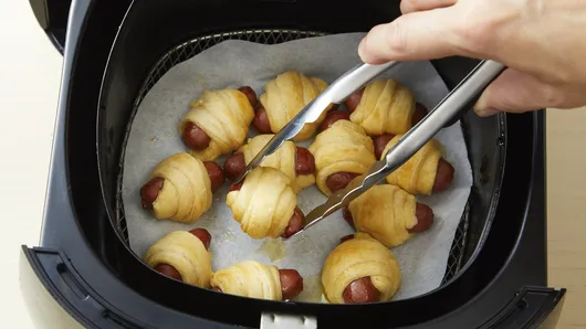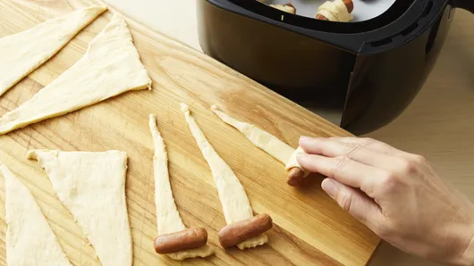 var configuration = {"title":"Air Fryer Pigs in a Blanket","introduction":"\u003cp\u003eAre air fryer pigs in a blanket a satisfying snack, an irresistible appetizer, or dinner you can eat with your fingers? They’re all three! Pigs in a blanket are sausages baked in a cozy wrapping of flaky pastry—or sometimes breakfast sausages wrapped in pancakes—and have been loved by families for decades. Ours are made easy and delicious using Pillsbury™ crescent dough, and they’re something everyone can raise their forks to.\u003c/p\u003e\u003cp\u003eSince our original snack-size crescent dog recipe appeared over 25 years ago, our fans can’t get enough, and we’ve listened! We’ve been getting into the kitchen to create even more ways to enjoy crescent-wrapped pigs in a blanket, including this popular air fryer version.\u003c/p\u003e","servingSize":"1 Mini Crescent Dog","image":{"small":{"media":"(min-width: 0px)","src":"https://mojo.generalmills.com/api/public/content/rrgGkdDkikqVhIF8FaWqHQ_webp_base.webp?v=2290cfe6\u0026t=e724eca7b3c24a8aaa6e089ed9e611fd"},"medium":{"media":"(min-width: 500px)","src":"https://mojo.generalmills.com/api/public/content/rrgGkdDkikqVhIF8FaWqHQ_webp_base.webp?v=2290cfe6\u0026t=191ddcab8d1c415fa10fa00a14351227"},"large":{"media":"(min-width: 767px)","src":"https://mojo.generalmills.com/api/public/content/rrgGkdDkikqVhIF8FaWqHQ_webp_base.webp?v=2290cfe6\u0026t=191ddcab8d1c415fa10fa00a14351227"},"alt":"Air Fryer Pigs in a Blanket"},"contributor":{"label":"By","name":"Pillsbury Kitchens","profileUrl":"/about-us","displayDate":{"label":"Updated","date":"Jun 3, 2025"}},"ingredientGroups":[{"ingredients":[{"quantity":"1","description":"can (8 oz) refrigerated Pillsbury™ Original Crescent Rolls (8 Count)","productLink":"/products/crescents/original"},{"quantity":"24","description":"cocktail-size smoked link sausages or hot dogs (14-oz package)"}]}],"steps":[{"description":"\u003cp\u003eCut an 8-inch round of cooking parchment paper. Place in bottom of air fryer basket.\u003c/p\u003e"},{"description":"\u003cp\u003eUnroll dough; separate into 8 triangles. Cut each triangle lengthwise into 3 narrow triangles.\u003c/p\u003e","stepShotImageUrl":"//mojo.generalmills.com/api/public/content/D6YdpjBOqEGHcUadqBWC6g_webp_base.webp?v=89130ccb\u0026t=51a43a57af4046789e5a7f20567b1195"},{"description":"\u003cp\u003ePlace sausage on shortest side of each triangle. Roll up each, starting at shortest side of triangle and rolling to opposite point; place 12 wrapped sausages point side down on parchment in air fryer basket.\u003c/p\u003e","stepShotImageUrl":"//mojo.generalmills.com/api/public/content/yjqH1nZ8jk6I9IN512O6kQ_webp_base.webp?v=c7c026ee\u0026t=51a43a57af4046789e5a7f20567b1195"},{"description":"\u003cp\u003eSet air fryer to 325°F; cook 3 to 4 minutes or until crescent tops are light brown. With tongs, turn crescent dogs over; bake an additional 3 to 4 minutes or until golden brown. Remove from air fryer. Repeat with remaining 12 wrapped sausages. Serve warm.\u003c/p\u003e","stepShotImageUrl":"//mojo.generalmills.com/api/public/content/56MXRVP6l0yqQTgRm94zwg_webp_base.webp?v=7efed5f6\u0026t=51a43a57af4046789e5a7f20567b1195"}],"tips":[{"title":"","description":"Our top-rated mini air fryer pigs in a blanket are simply irresistible for a snack, dinner, or appetizer. You’ll need just 2 ingredients and 20 minutes.","category":"Rich Snippet","tipShots":[]},{"title":"","description":"Air fryer temperature control settings vary according to brand and model. If your air fryer does not have the exact temperature setting called for in the recipe, consult your manual for suggested temperature settings.","category":"Techniques","tipShots":[]},{"title":"","description":"Our recipes do not call for preheating your air fryer. Just set the temperature, and start. Never preheat with parchment paper alone.","category":"Techniques","tipShots":[]},{"title":"","description":"\u003cp\u003eTo save time, prep 12 pigs in a blanket, and place in the air fryer. While they are cooking, prep the remaining 12.\u003c/p\u003e","category":"Time Saving","tipShots":[]},{"title":"","description":"\u003cp\u003eMaking the pigs in a blanket in two batches gives enough space for each one to cook without touching, so each crescent can cook through to golden brown goodness. If you have a smaller air fryer, cook in more batches.\u003c/p\u003e","category":"Techniques","tipShots":[]},{"title":"","description":"\u003cp\u003eServe pigs in a blanket with ketchup, horseradish sauce, chili sauce, or mustard for dipping.\u003c/p\u003e","category":"Serving Suggestions/Menu","tipShots":[]},{"title":"","description":"Kitchen Tested - 6/2019","category":"Kitchen Tested","tipShots":[]}],"kitchenTips":[{"title":"","description":"Air fryer temperature control settings vary according to brand and model. If your air fryer does not have the exact temperature setting called for in the recipe, consult your manual for suggested temperature settings.","category":"Techniques","tipShots":[]},{"title":"","description":"Our recipes do not call for preheating your air fryer. Just set the temperature, and start. Never preheat with parchment paper alone.","category":"Techniques","tipShots":[]},{"title":"","description":"\u003cp\u003eTo save time, prep 12 pigs in a blanket, and place in the air fryer. While they are cooking, prep the remaining 12.\u003c/p\u003e","category":"Time Saving","tipShots":[]},{"title":"","description":"\u003cp\u003eMaking the pigs in a blanket in two batches gives enough space for each one to cook without touching, so each crescent can cook through to golden brown goodness. If you have a smaller air fryer, cook in more batches.\u003c/p\u003e","category":"Techniques","tipShots":[]},{"title":"","description":"\u003cp\u003eServe pigs in a blanket with ketchup, horseradish sauce, chili sauce, or mustard for dipping.\u003c/p\u003e","category":"Serving Suggestions/Menu","tipShots":[]}],"additionalContent":[{"title":"How 