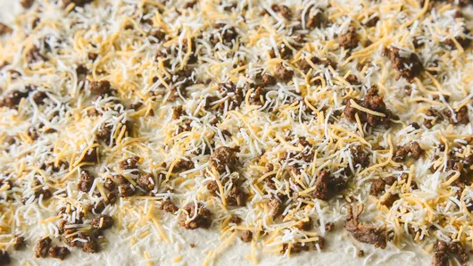 Step4Add the taco meat evenly on top of the pizza dough. Sprinkle the cheese evenly on top.