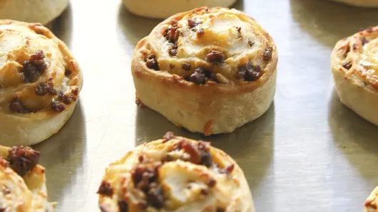 Step5Starting with the long edge of the pizza dough, roll dough tightly up into a roll. Using a serrated knife, make about 1-inch slices along the roll, making about 18 rolls.