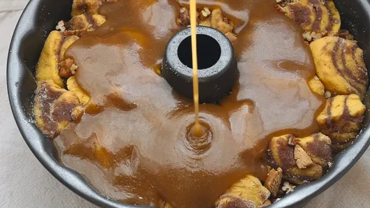 Step4In microwavable bowl, microwave butter on High until melted. Stir in brown sugar. Pour over roll pieces.