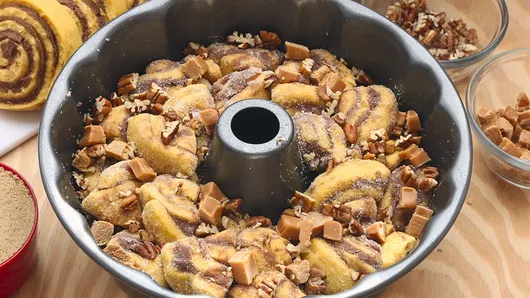 Step3Arrange pieces in pan. Top with one-third of chopped caramels and pecans. Repeat layers ending with roll pieces.