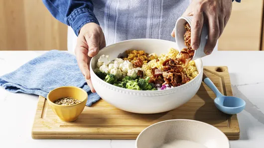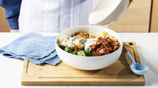 var configuration = {"title":"Sunny Broccoli Pasta Salad","introduction":"It’s no secret why this pretty salad is so popular: It’s the perfect combination of creamy, sweet and bacon-y. Plus it’s full of crunchy texture—so satisfying! And you know what makes it even more delicious and hearty? Bouncy radiatore pasta. ","servingSize":"3/4 Cup","image":{"small":{"media":"(min-width: 0px)","src":"https://mojo.generalmills.com/api/public/content/GJOCL_YK8EaRx1gcS8zxHw_webp_base.webp?v=65d391ca\u0026t=e724eca7b3c24a8aaa6e089ed9e611fd"},"medium":{"media":"(min-width: 500px)","src":"https://mojo.generalmills.com/api/public/content/GJOCL_YK8EaRx1gcS8zxHw_webp_base.webp?v=65d391ca\u0026t=191ddcab8d1c415fa10fa00a14351227"},"large":{"media":"(min-width: 767px)","src":"https://mojo.generalmills.com/api/public/content/GJOCL_YK8EaRx1gcS8zxHw_webp_base.webp?v=65d391ca\u0026t=191ddcab8d1c415fa10fa00a14351227"},"alt":"Sunny Broccoli Pasta Salad"},"contributor":{"label":"By","name":"Pillsbury Kitchens","profileUrl":"/about-us","displayDate":{"label":"Updated","date":"Aug 31, 2023"}},"ingredientGroups":[{"name":"Dressing","ingredients":[{"quantity":"1/2","description":"cup light mayonnaise or spreadable salad dressing"},{"quantity":"1/3","description":"cup milk"},{"quantity":"1","description":"tablespoon cider vinegar"},{"quantity":"2","description":"teaspoons sugar"},{"quantity":"1/2","description":"teaspoon salt"}]},{"name":"Salad","ingredients":[{"quantity":"1 1/2","description":"cups uncooked radiatore (nuggets) pasta (5 oz)"},{"quantity":"8","description":"slices bacon, crispy cooked and crumbled"},{"quantity":"2","description":"cups small broccoli florets"},{"quantity":"1","description":"cup small cauliflower florets"},{"quantity":"1/4","description":"cup finely chopped red onion"},{"quantity":"1/4","description":"cup golden raisins"},{"quantity":"3","description":"tablespoons shelled sunflower seeds"}]}],"steps":[{"description":"In small bowl, combine all dressing ingredients; blend with wire whisk until smooth. Refrigerate while cooking pasta.","stepShotImageUrl":"//mojo.generalmills.com/api/public/content/r0ZmUUgxvE29dSfvKTgBgw_webp_base.webp?v=eaae1222\u0026t=51a43a57af4046789e5a7f20567b1195"},{"description":"Cook pasta to desired doneness as directed on package.","stepShotImageUrl":"//mojo.generalmills.com/api/public/content/f-bxGBjDx026U9-gVZpkCw_webp_base.webp?v=09931ead\u0026t=51a43a57af4046789e5a7f20567b1195"},{"description":" Drain; rinse with cold water to cool. Drain well.","stepShotImageUrl":"//mojo.generalmills.com/api/public/content/eceP9XbLZ0ytDZfTNLFcdw_webp_base.webp?v=9fd68d80\u0026t=51a43a57af4046789e5a7f20567b1195"},{"description":"In large bowl, combine cooked pasta and all remaining salad ingredients. ","stepShotImageUrl":"//mojo.generalmills.com/api/public/content/B2RypvhpdkO_tbm1ZCTzQw_webp_base.webp?v=47322498\u0026t=51a43a57af4046789e5a7f20567b1195"},{"description":"Pour dressing over salad; toss gently to coat. ","stepShotImageUrl":"//mojo.generalmills.com/api/public/content/LNfGPdq7ZU2LT-sg--uPJg_webp_base.webp?v=3f488c62\u0026t=51a43a57af4046789e5a7f20567b1195"},{"description":"Cover; refrigerate at least 30 minutes to blend flavors.","stepShotImageUrl":"//mojo.generalmills.com/api/public/content/lNEhl1R9tEeWwG_hWJbENA_webp_base.webp?v=1bf92895\u0026t=51a43a57af4046789e5a7f20567b1195"}],"tips":[{"title":"","description":"If you can’t find radiatore pasta at your local grocery store, you can use one of the other spiral pastas, like rotini or fusilli. Why the focus on spirals? That shape is really good at hanging onto the dressing, so every bite of salad is delicious. Plus, they’re bite-size, which makes them fork friendly—and very pretty with the florets and other goodies in the salad.","category":"Substitution","tipShots":[]},{"title":"","description":"Save time and avoid heating up the kitchen by purchasing precooked bacon. Look for it in the refrigerated or deli sections of your local grocery store.","category":"Time Saving","tipShots":[]},{"title":"","description":"Mayonnaise or spreadable salad dressing—what’s the difference? They\u0027re both thick, creamy dressings that contain vegetable oil, lemon juice or vinegar and seasonings. Mayonnaise also contains egg yolk and is less sweet than salad dressing. They can be used interchangeably in this Sunny Broccoli Pasta Salad, so you decide which one you prefer! ","category":"Recipe/Ingredient Facts","tipShots":[]},{"title":"","description":"Enjoy a refreshing broccoli pasta salad with crisp florets and al dente pasta tossed in zesty dressing. A delightful blend of textures and flavors that\u0027s perfect for any occasion.","category":"Rich Snippet","tipShots":[]}],"kitchenTips":[{"title":"","description":"If you can’t find radiatore pasta at your local grocery store, you can use one of the other spiral pastas, like rotini or fusilli. Why the focus on spirals? That shape is really good at hanging onto the dressing, so every bite of salad is delicious. Plus, they’re bite-size, which makes them fork friendly—and very pretty with the florets and other goodies in the salad.","category":"Substitution","tipShots":[]},{"title":"","description":"Save time and avoid heating up the kitchen by purchasing precooked bacon. Look for it in the refrigerated or deli sections of your local grocery store.","category":"Time Saving","tipShots":[]},{"title":"","description":"Mayonnaise or spreadable salad dressing—what’s the difference? They\u0027re both thick, creamy dressings that contain vegetable oil, lemon juice or vinegar and seasonings. Mayonnaise also contains egg yolk and is less sweet than salad dressing. They can be used interchangeably in this Sunny Broccoli Pasta Salad, so you decide which one you prefer! ","category":"Recipe/Ingredient Facts","tipShots":[]}],"additionalContent":[{"title":"What’s in Sunny Broccoli Pasta Salad?","description":"\u003cp\u003eIn the classic version of the salad, it’s made