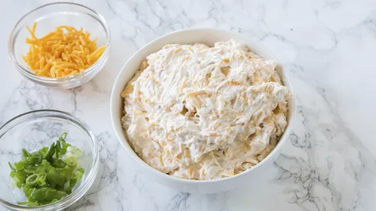Step1In large bowl, mix cream cheese, sour cream and dressing mix until well blended. Stir in shredded cheddar cheese.